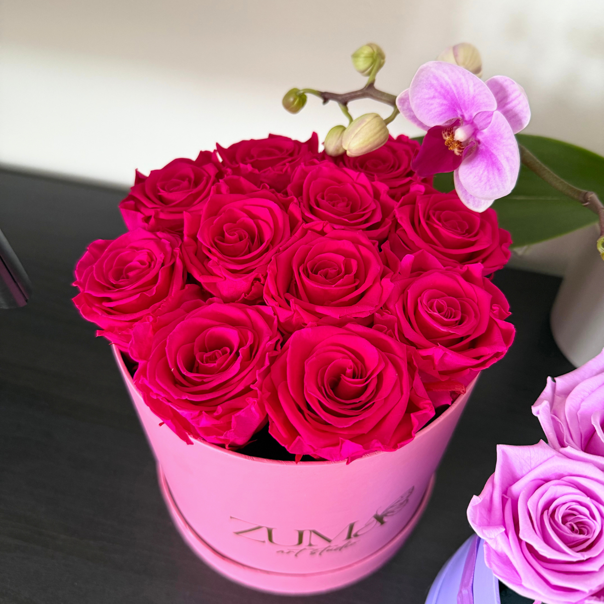 Our luxurious Small Round arrangements are comprised of 8 gorgeous Eternity Roses set in Parisian hat box-inspired vases. The classic arrangements will elevate any space with grace and majesty.