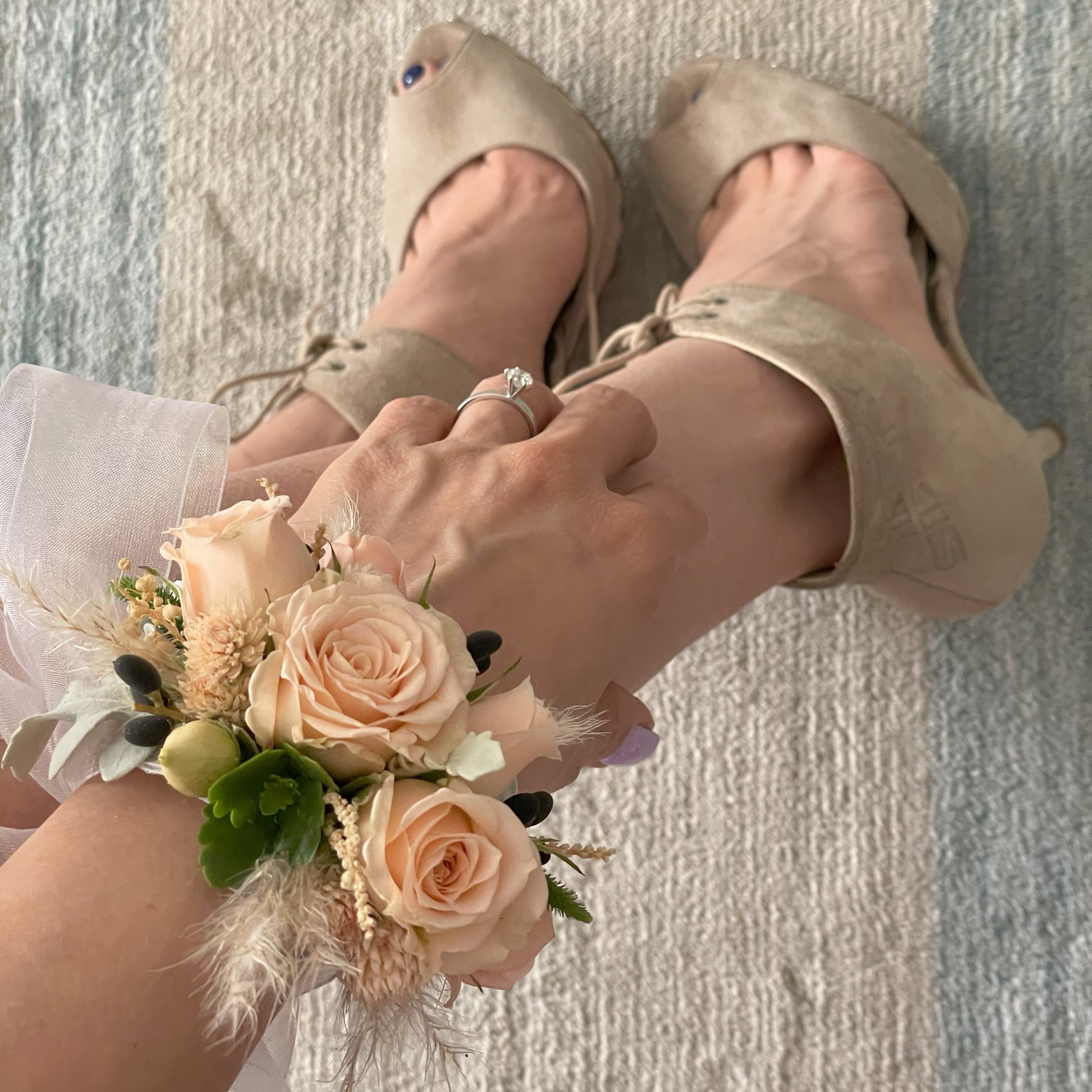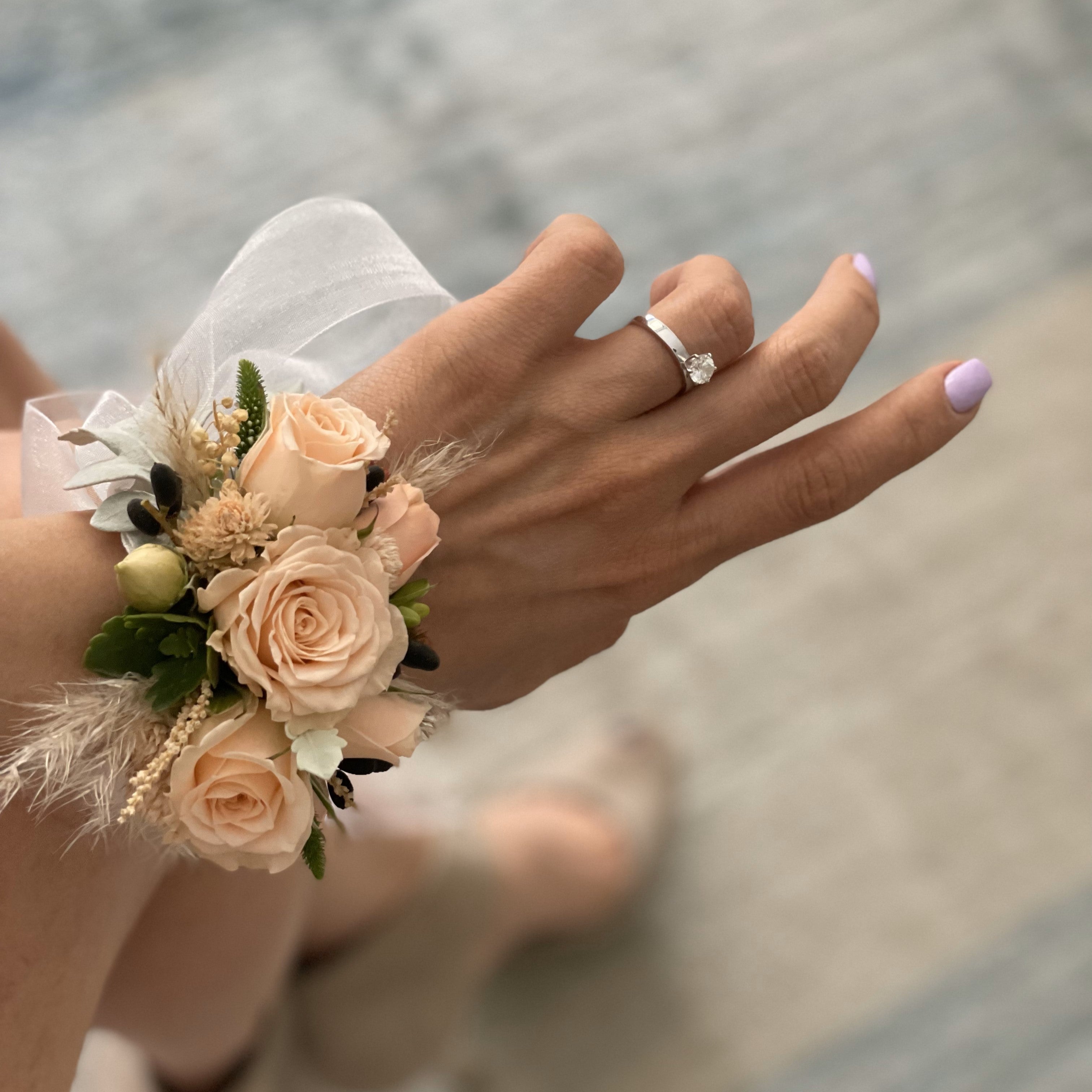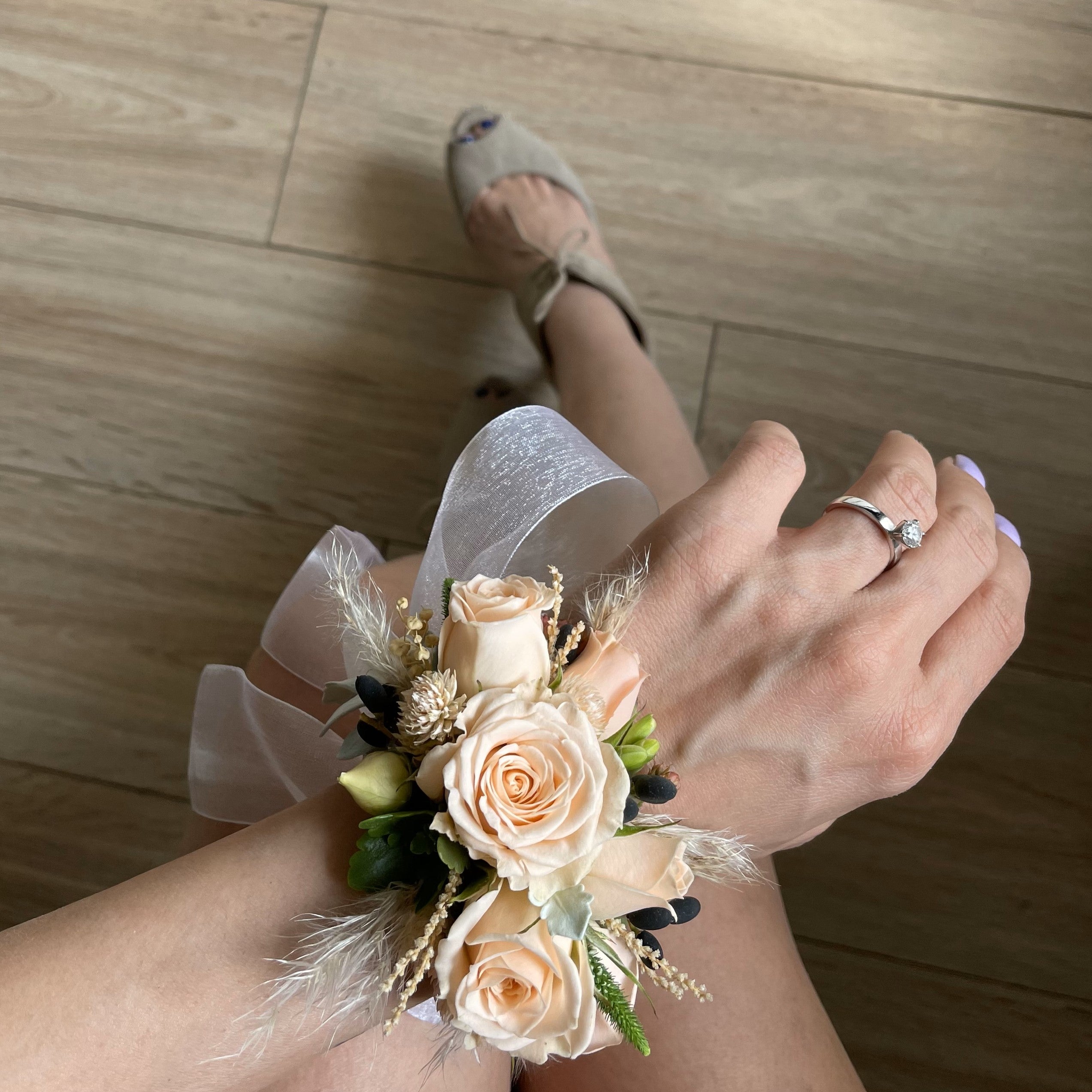 Embrace the elegance of simplicity with our Peach Rose Wrist Corsage, a delicate arrangement of soft peach roses accented with fine greenery and pampas grass. This corsage is the perfect accessory for weddings, proms, or any special occasion, adding a touch of natural beauty to your look. Each corsage is crafted with care, blending soft, muted colors that complement any outfit, making it a sophisticated choice for bridesmaids, mothers of the bride, or prom dates.