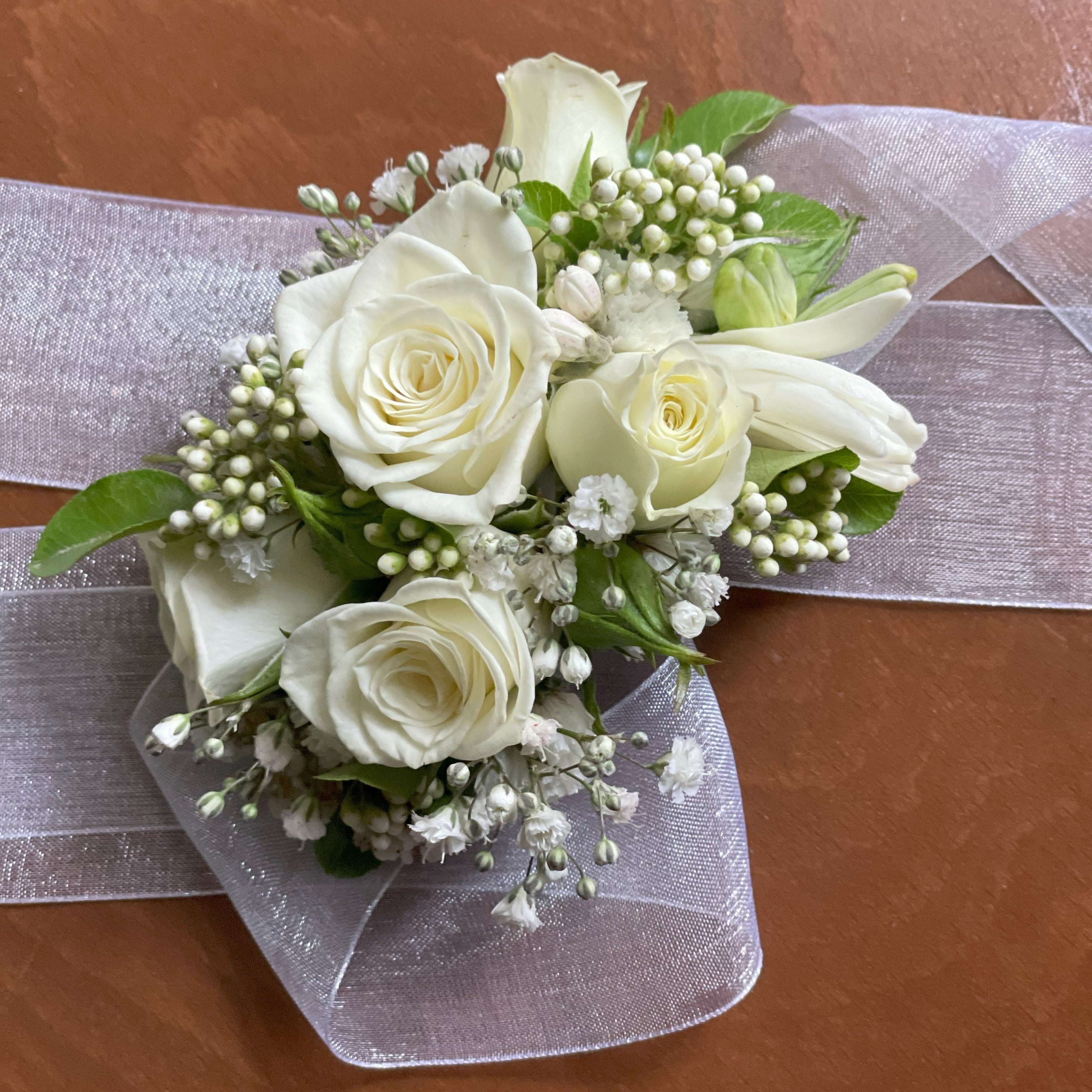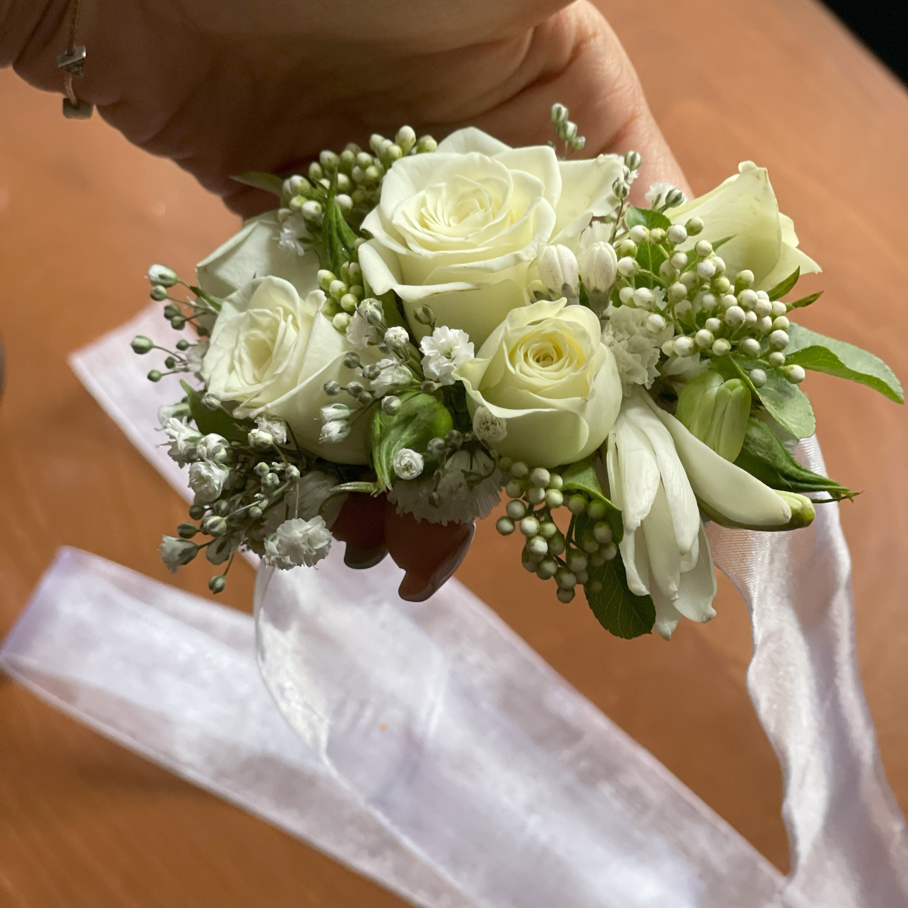This stunning white rose wrist corsage embodies timeless elegance and sophistication. Delicately crafted with fresh, pure white...