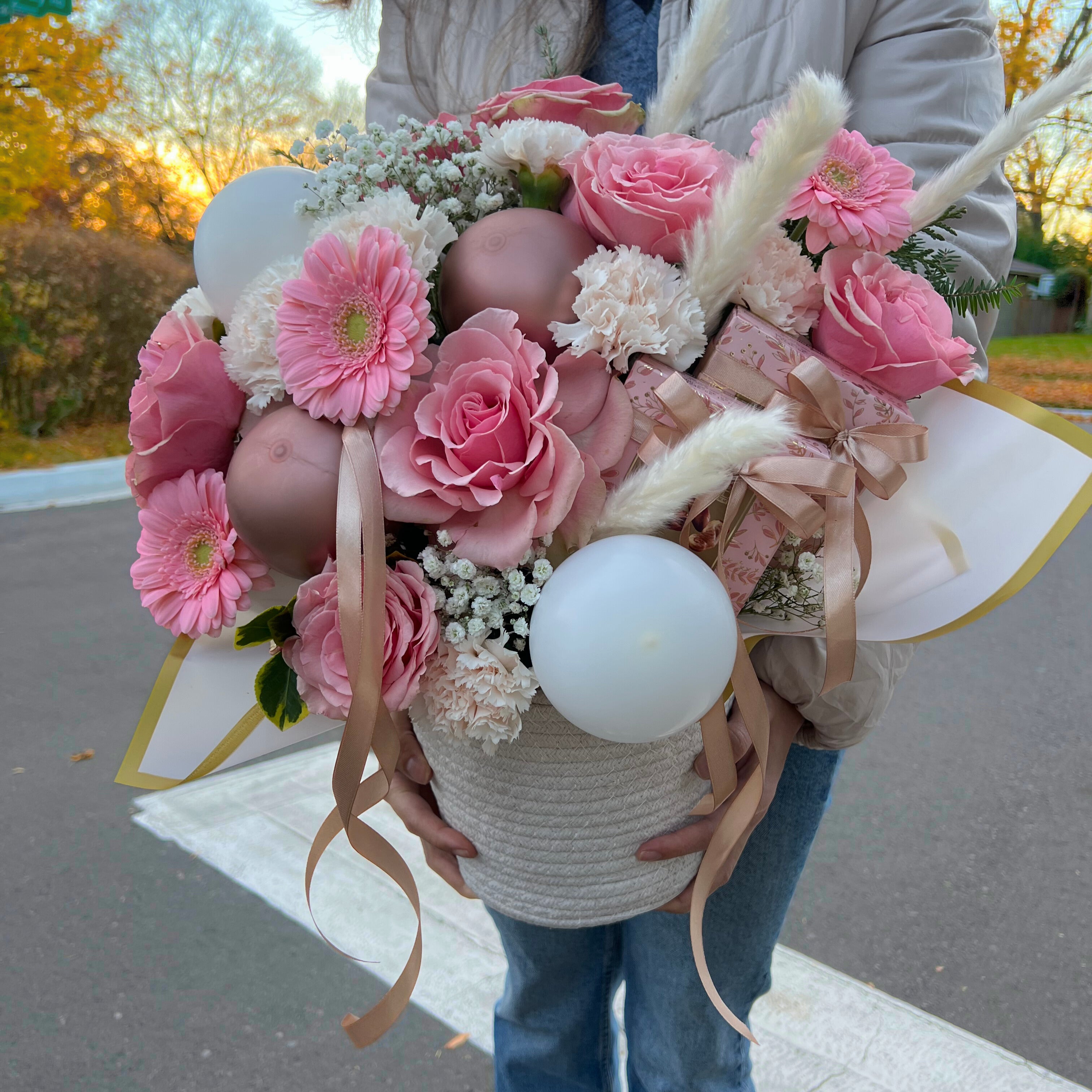 Enhance your gifting experience with our Deluxe Pink Fresh Flower Arrangement, an eye-catching and thoughtful ensemble designed to spread joy and love. This arrangement showcases a stunning collection of fresh pink roses, cheerful gerbera daisies, delicate carnations, and baby's breath, complemented with elegant pampas grass for added texture. The arrangement is tastefully adorned with chic balloons and features a luxurious chocolate box for an extra touch of indulgence.