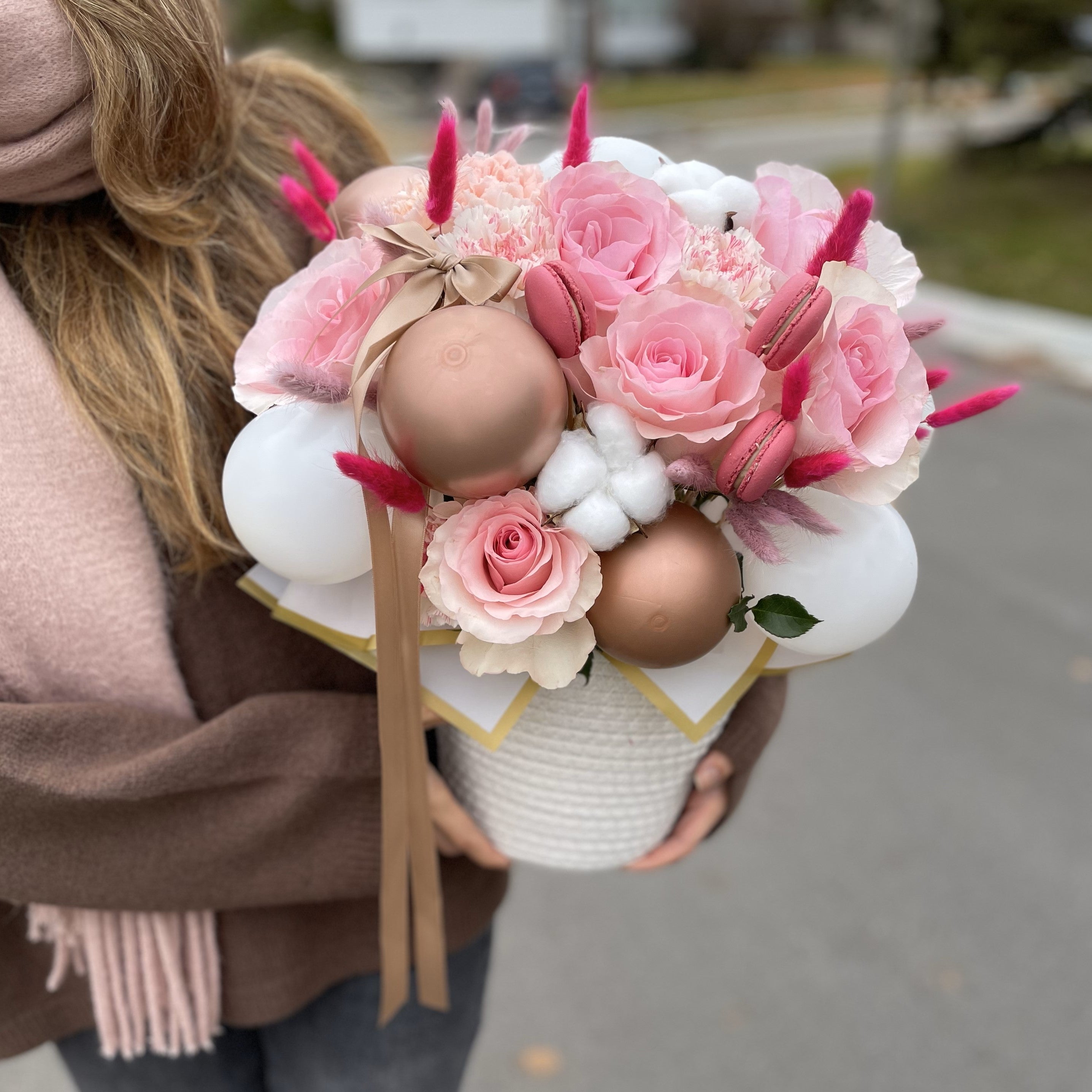 Enhance your gifting experience with our Deluxe Pink Fresh Flower Arrangement, an eye-catching and thoughtful ensemble designed to spread joy and love. This arrangement showcases a stunning collection of fresh pink roses, delicate carnations, Cotton flowers, and cheerful Macaroons complemented with elegant pampas grass for added texture. The arrangement is tastefully adorned with chic balloons and features a luxurious chocolate box for extra indulgence.