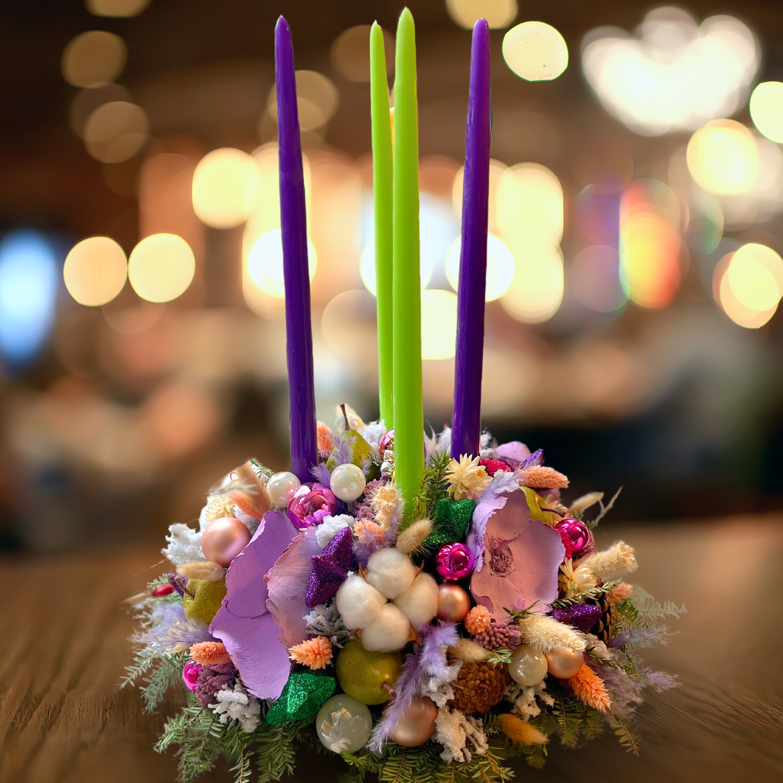 Elevate your home decor or festive table setting with this exquisite Forever Enchanted Centerpiece. A stunning combination of preserved flowers, natural elements, and decorative accents, this arrangement brings timeless beauty to any space. Featuring vibrant hues of purple, green, and soft pastels, it is elegantly adorned with decorative ornaments and topped with long-lasting candles, making it a perfect piece for celebrations or year-round elegance.