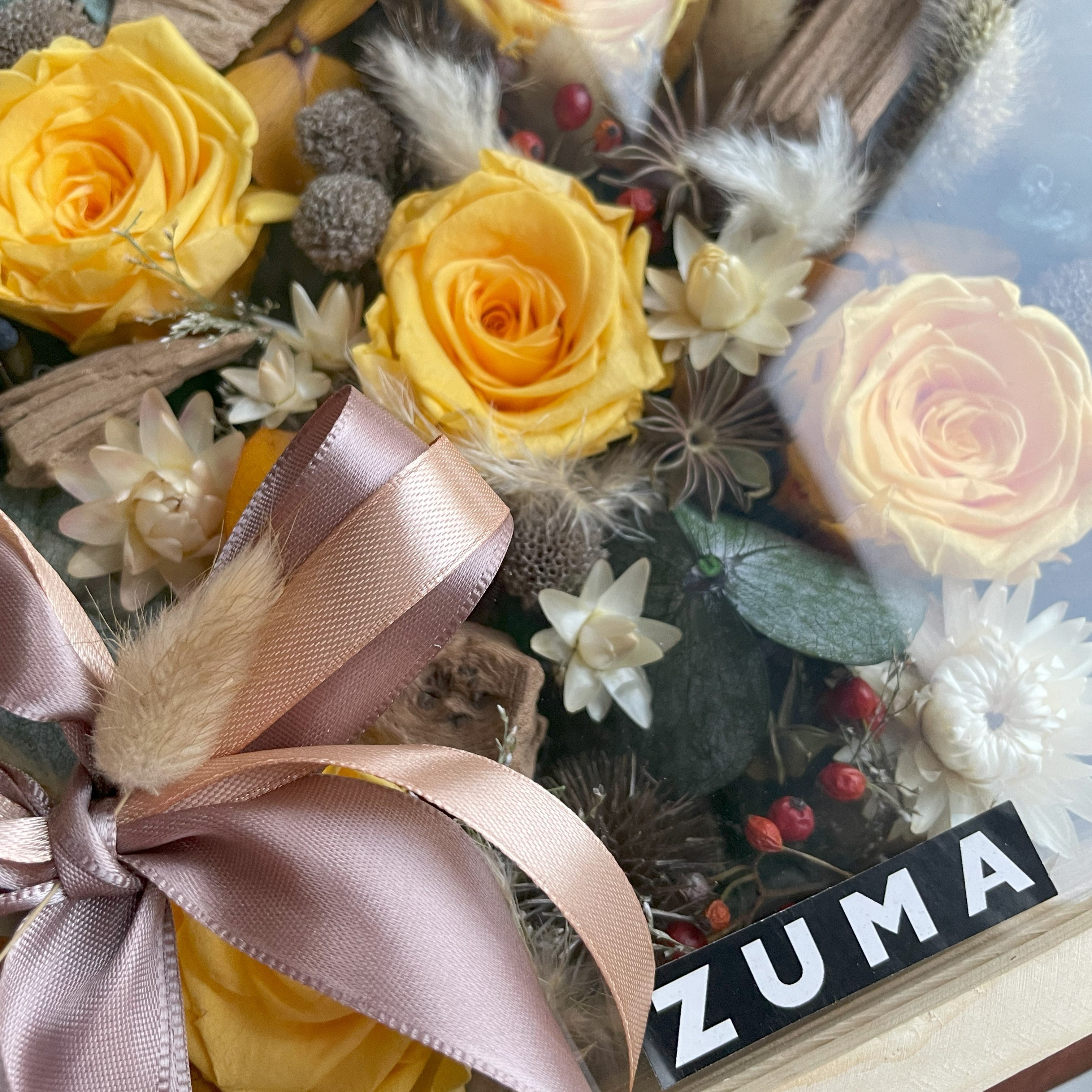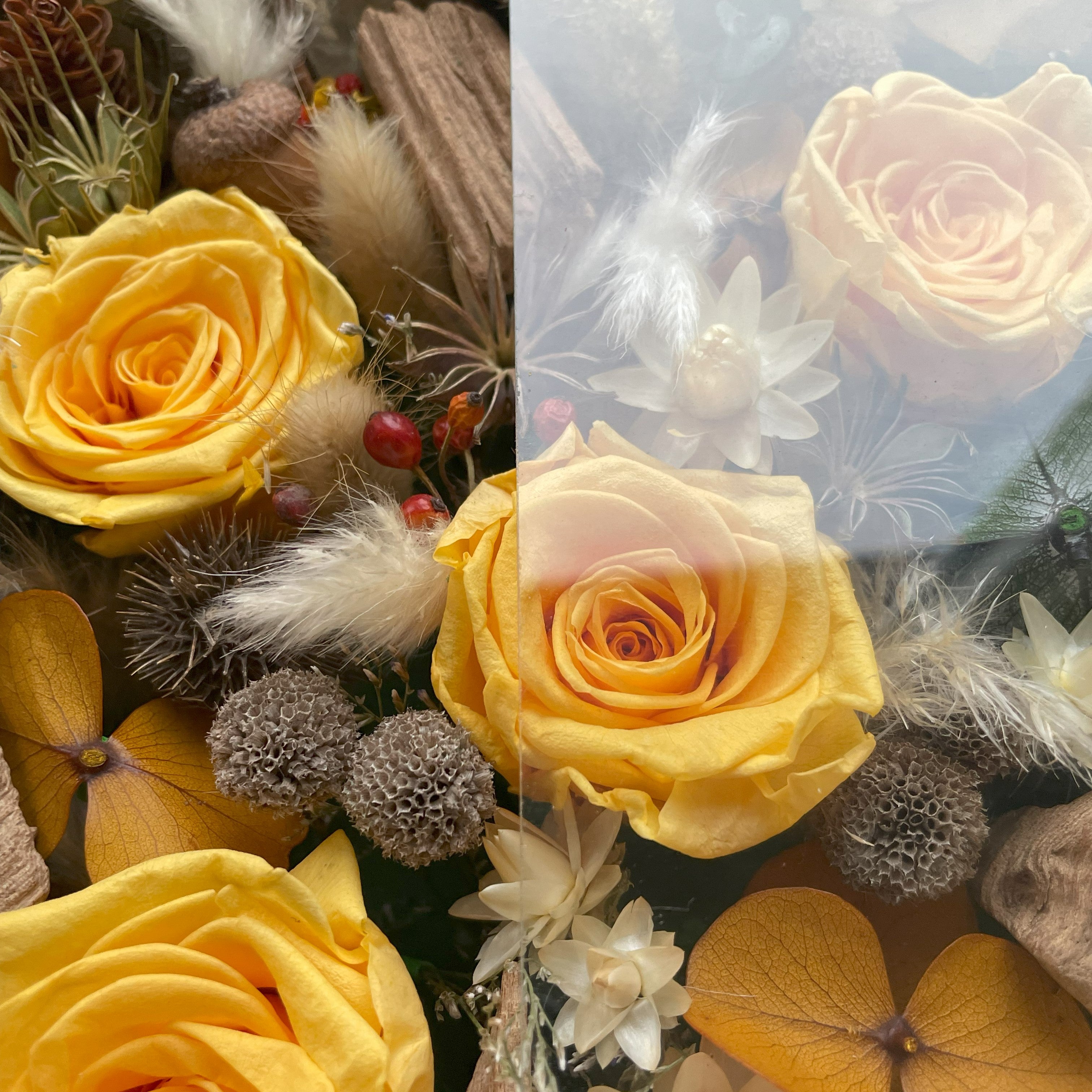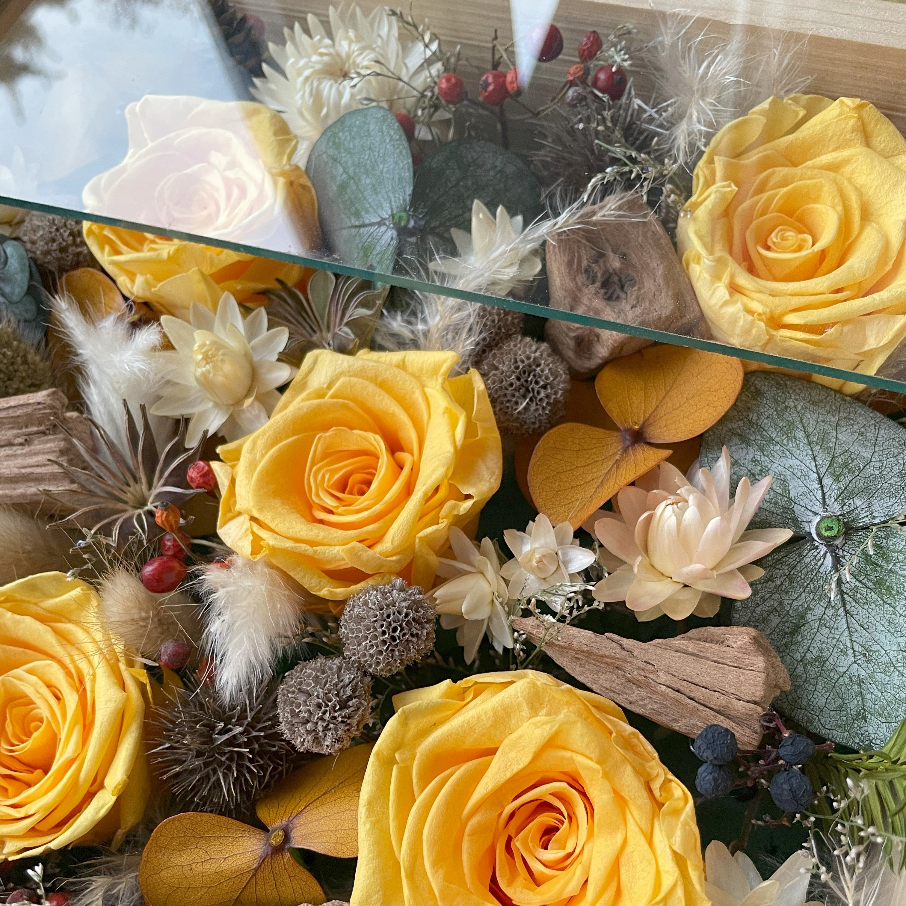 Add a touch of timeless beauty to any room with the Zuma Preserved Rose and Dried Flower Display Box. This exquisite arrangement features vibrant preserved yellow roses surrounded by an array of carefully selected dried flowers and botanicals. Each element has been meticulously arranged within a premium wooden shadow box, designed to showcase the natural beauty of preserved and dried flowers that can last for years without maintenance.