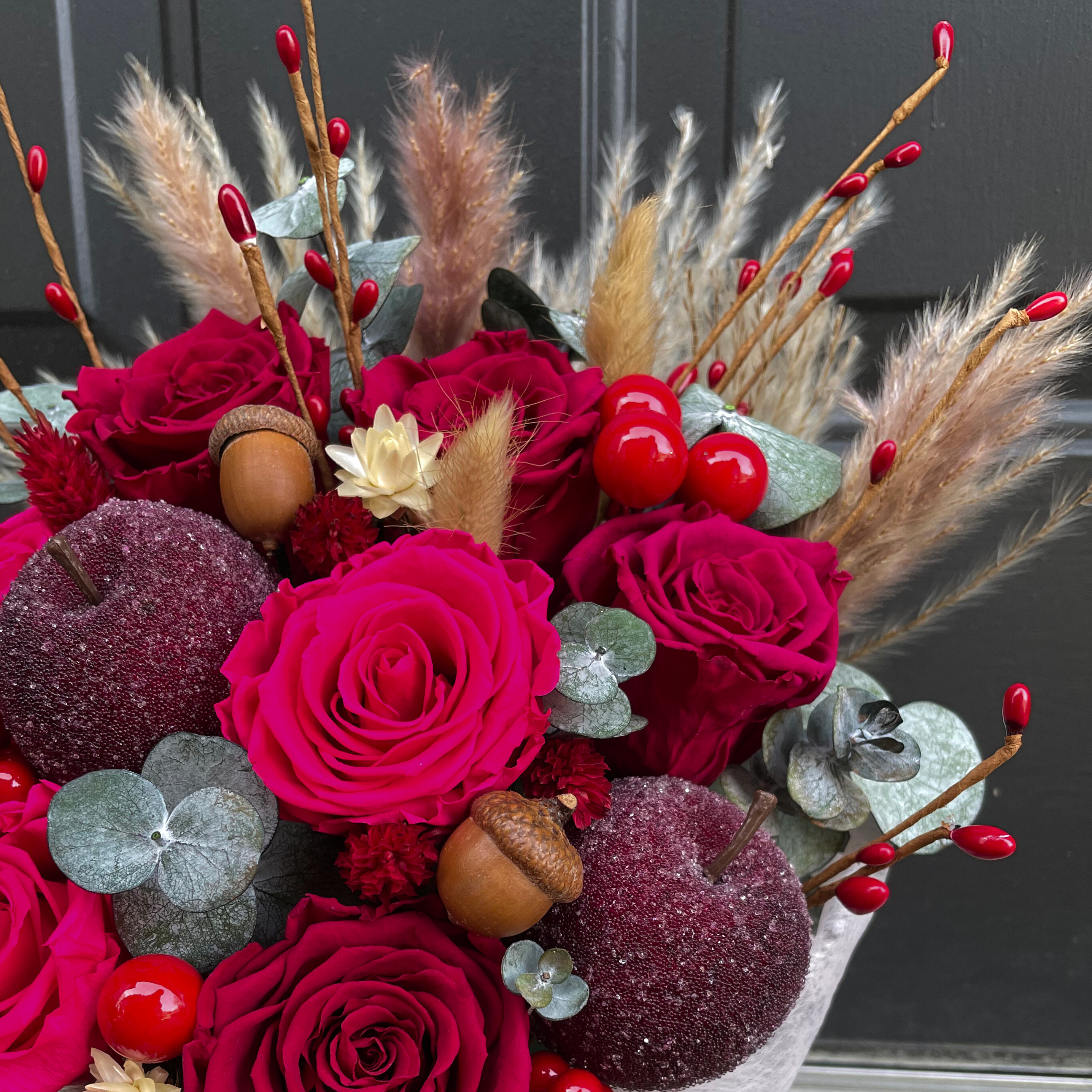 Add a touch of sophistication and passion to any occasion with our striking red floral arrangement. This preserved flower arrangement is thoughtfully designed with rich red roses, eucalyptus leaves, dried grasses, glittering artificial apples, and delicate red berries. Enhanced with natural accents like acorns and a bold red ribbon, this composition exudes warmth, elegance, and the spirit of everlasting beauty. Perfect for holidays, anniversaries, or as a stunning centerpiece for your home.