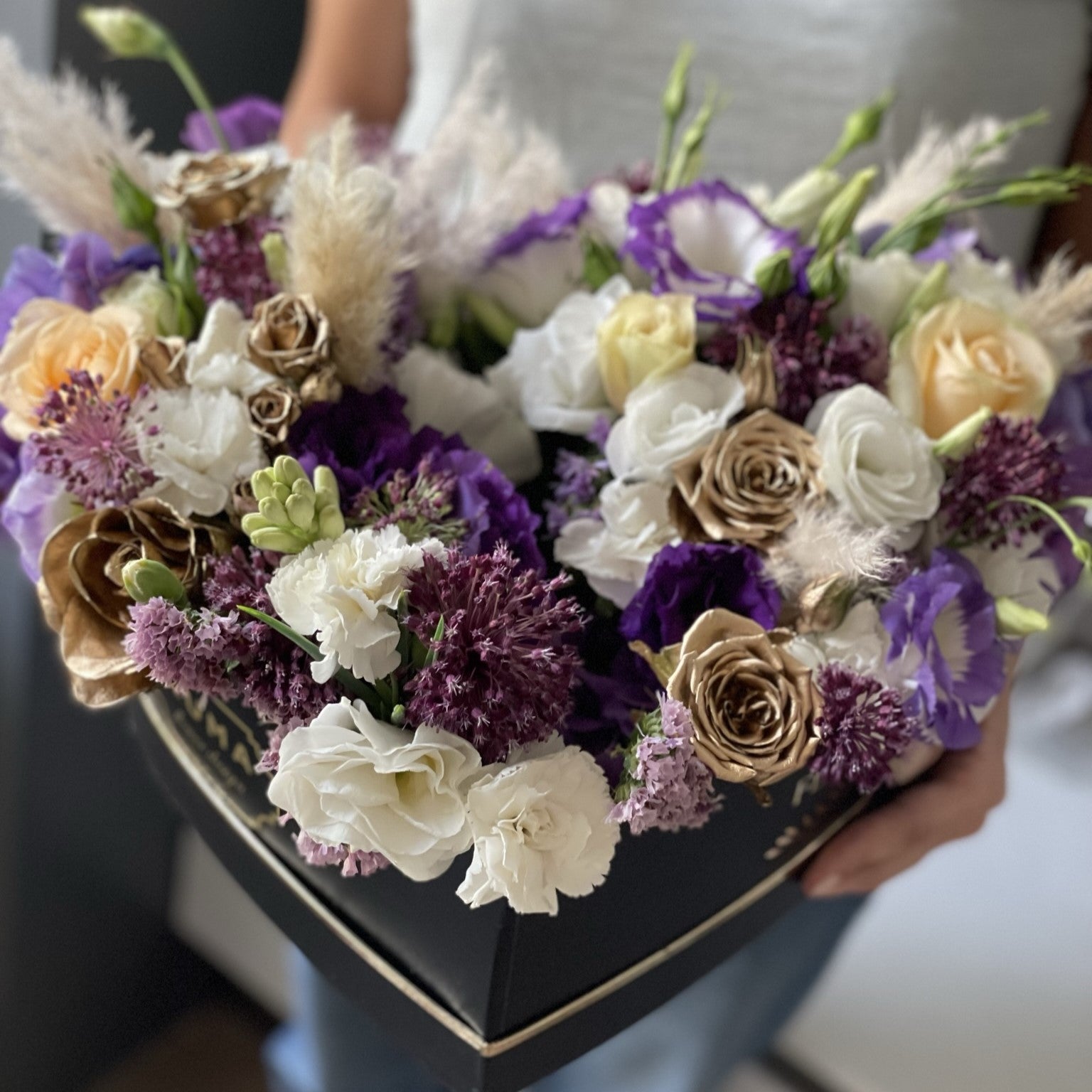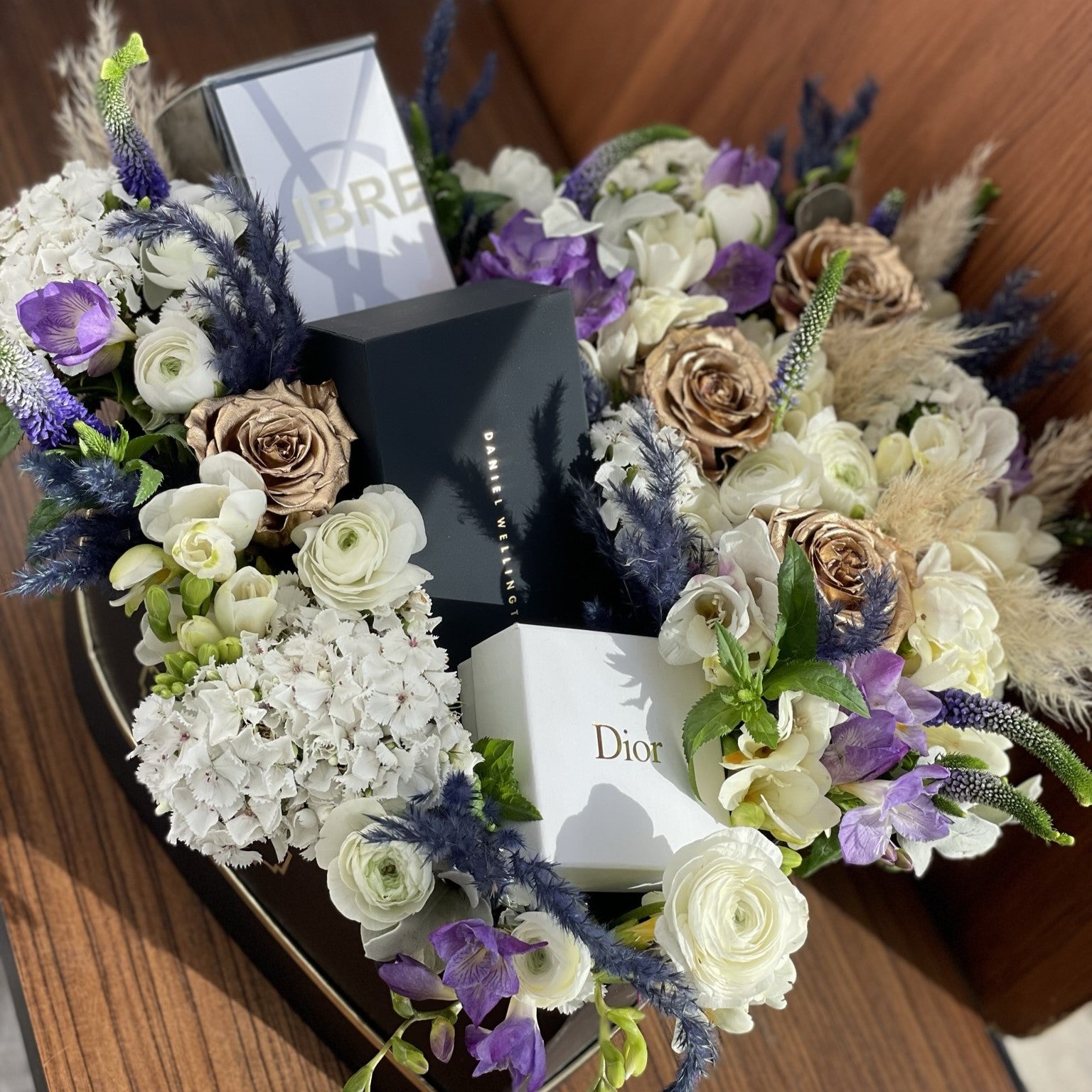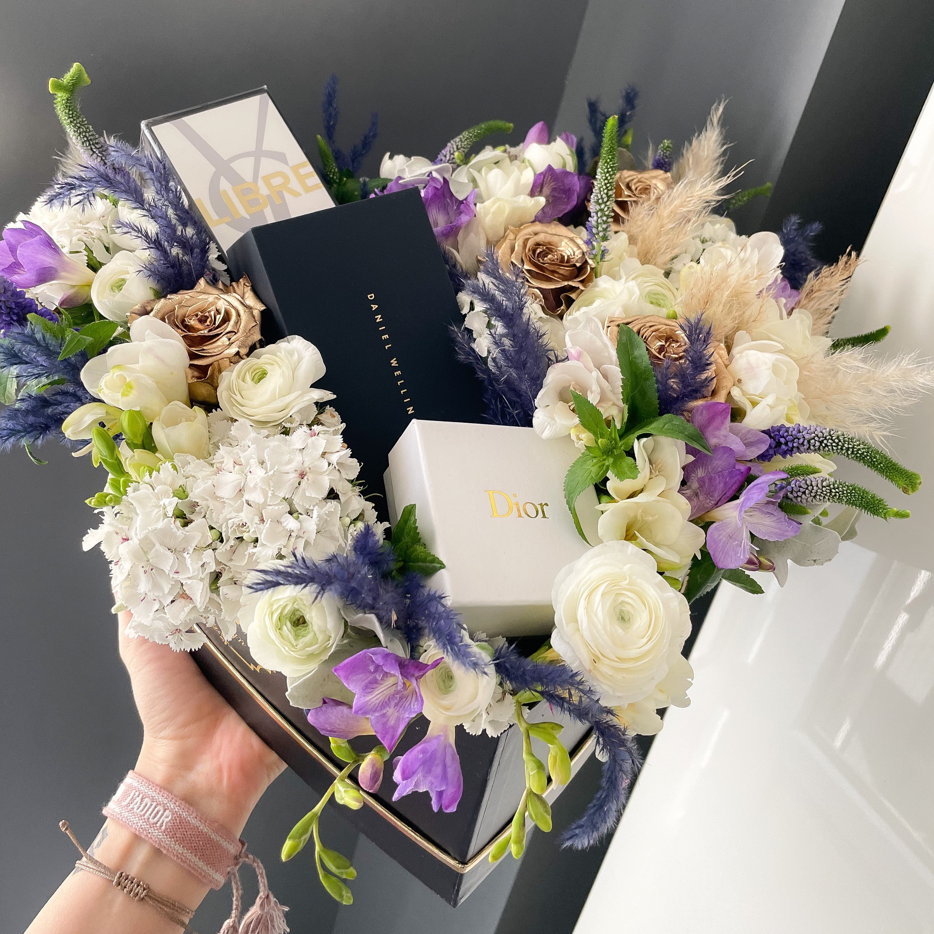 Add a touch of elegance and thoughtfulness to your gift-giving with our Heart-Shaped Floral Arrangement. This exquisite arrangement is thoughtfully designed with high-quality fresh flowers to cradle and showcase your gift in the center, making it an unforgettable display of affection and appreciation.