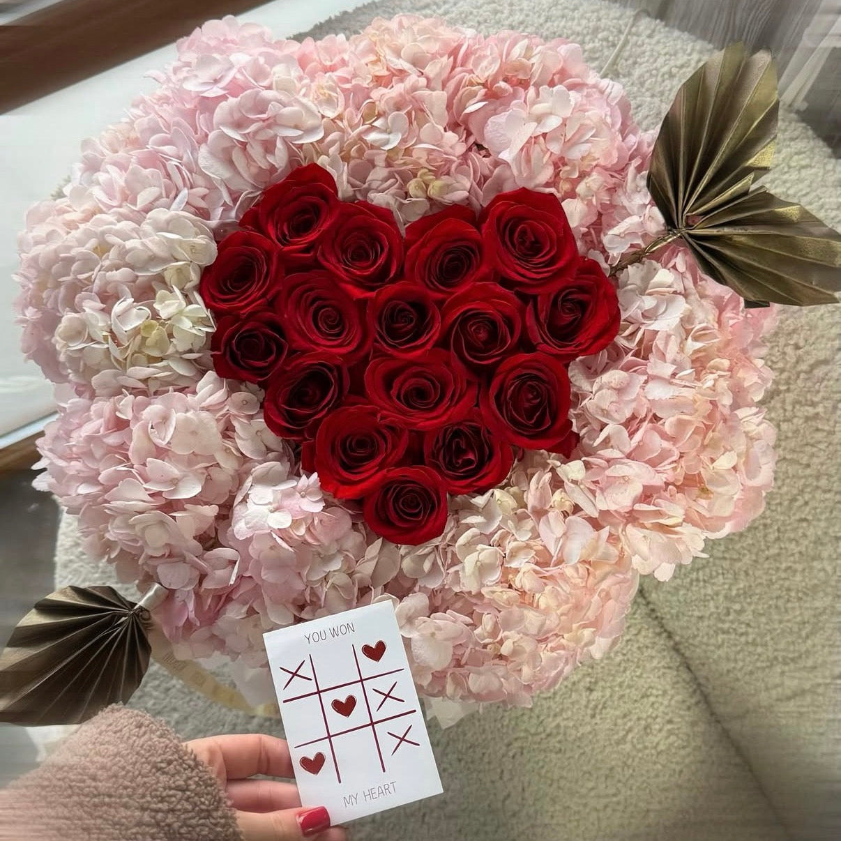 This luxury heart-shaped flower box is designed to make a statement. Featuring rich red roses arranged in a perfect heart and surrounded by delicate blush hydrangeas, this arrangement blends romance with elegance. Ideal for Valentine’s Day, anniversaries, or meaningful celebrations. Handcrafted with premium fresh flowers and presented in a refined round box for a timeless, editorial look.