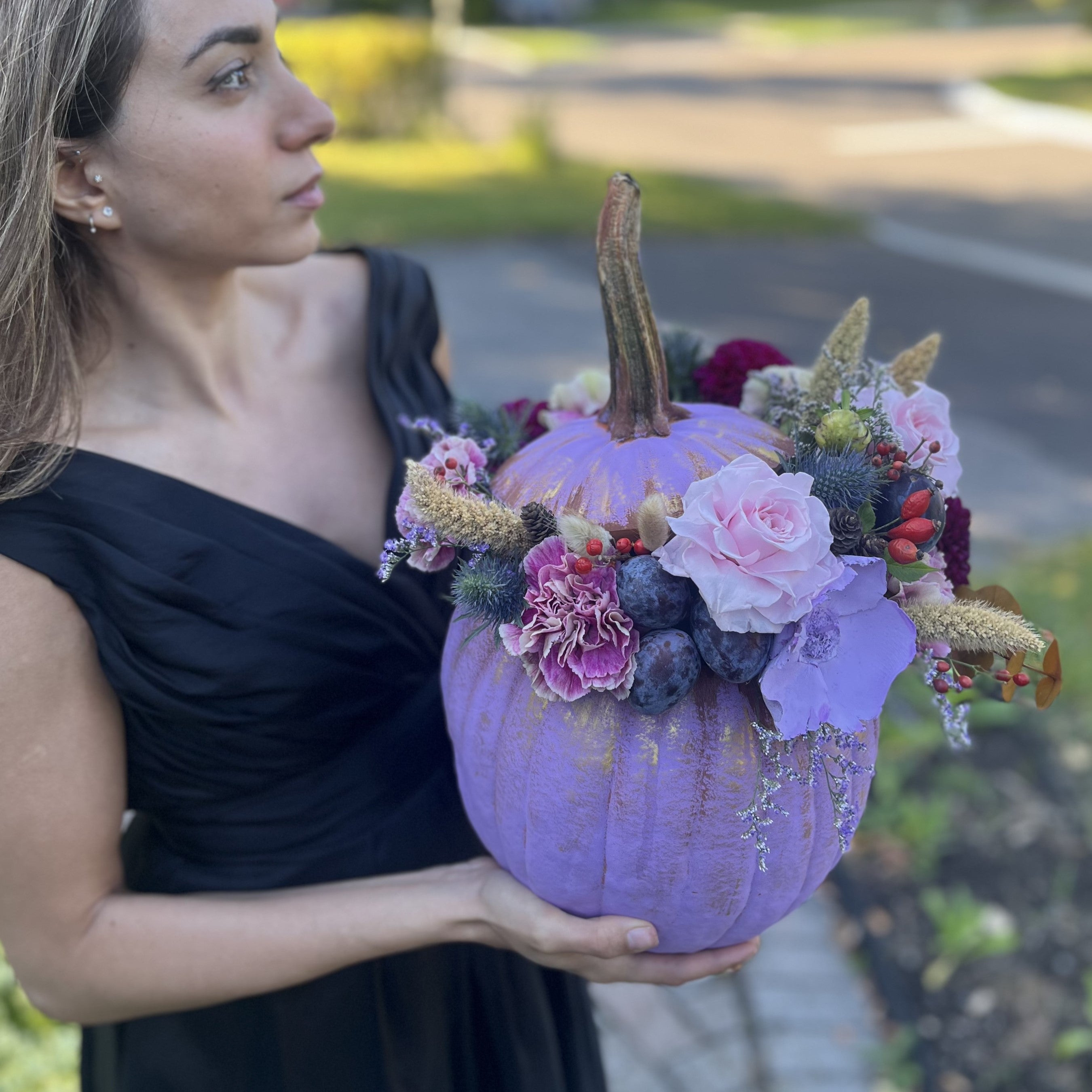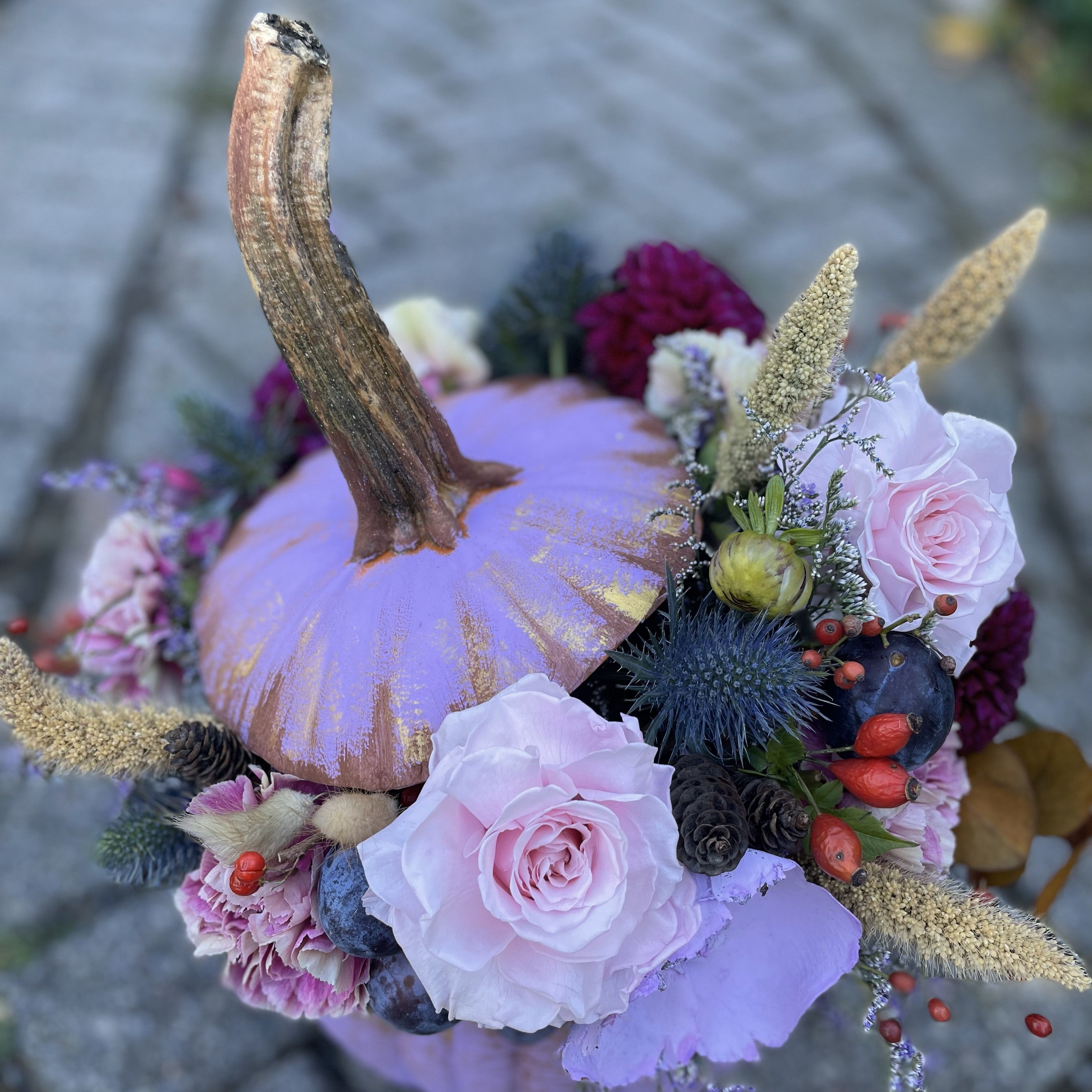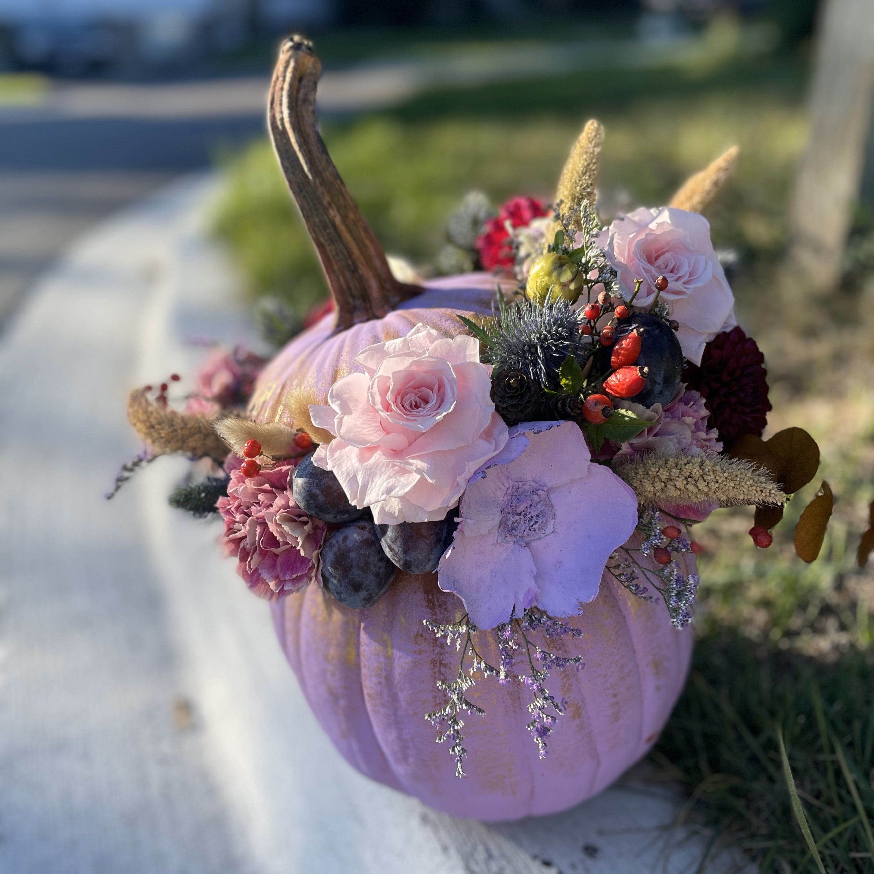 This enchanting pumpkin centerpiece is a sight to behold. A soft lavender hue sets the stage for a stunning array of delicate roses, vibrant berries, and lush greenery. The combination of textures and colors creates a truly captivating autumnal display that will add a touch of elegance to any space.