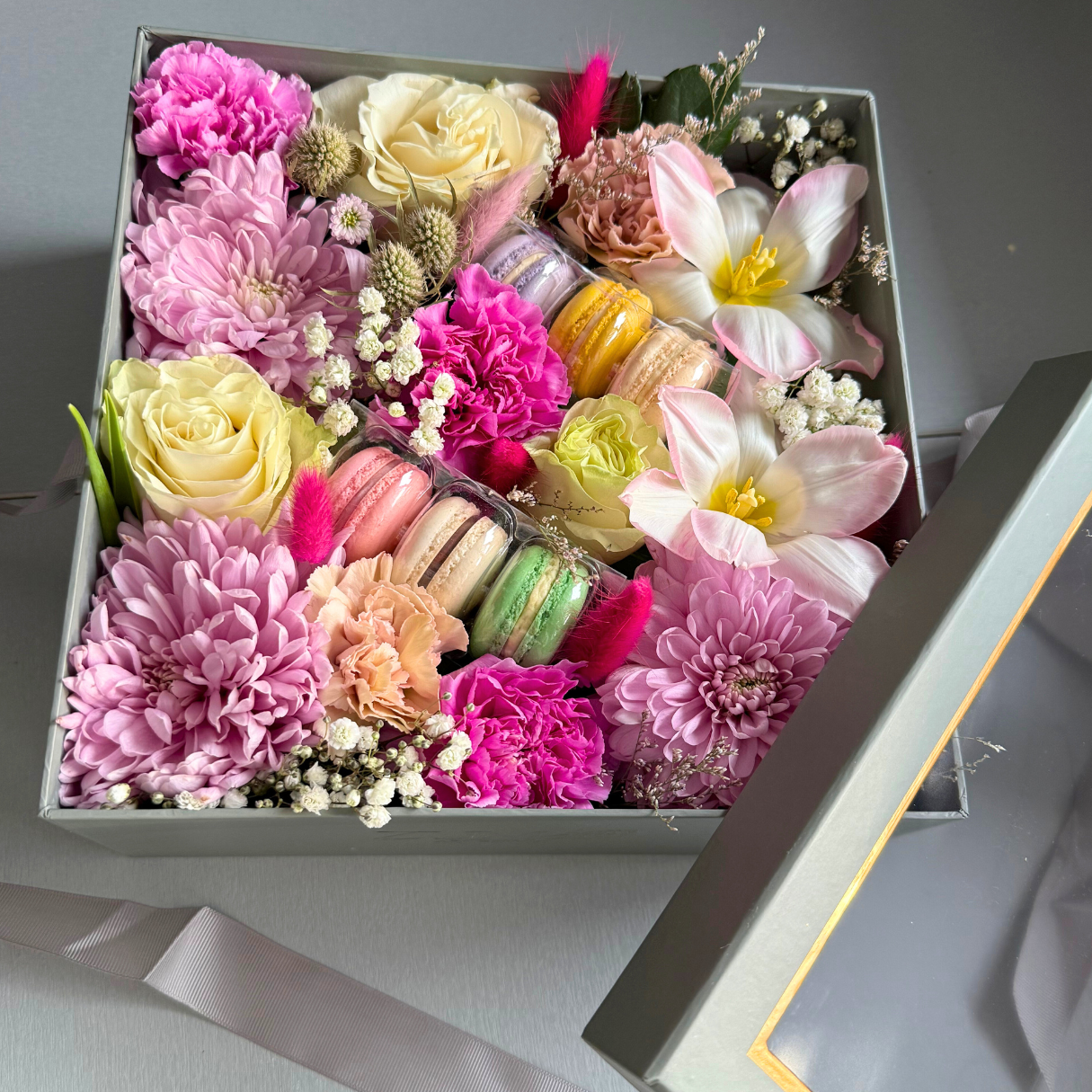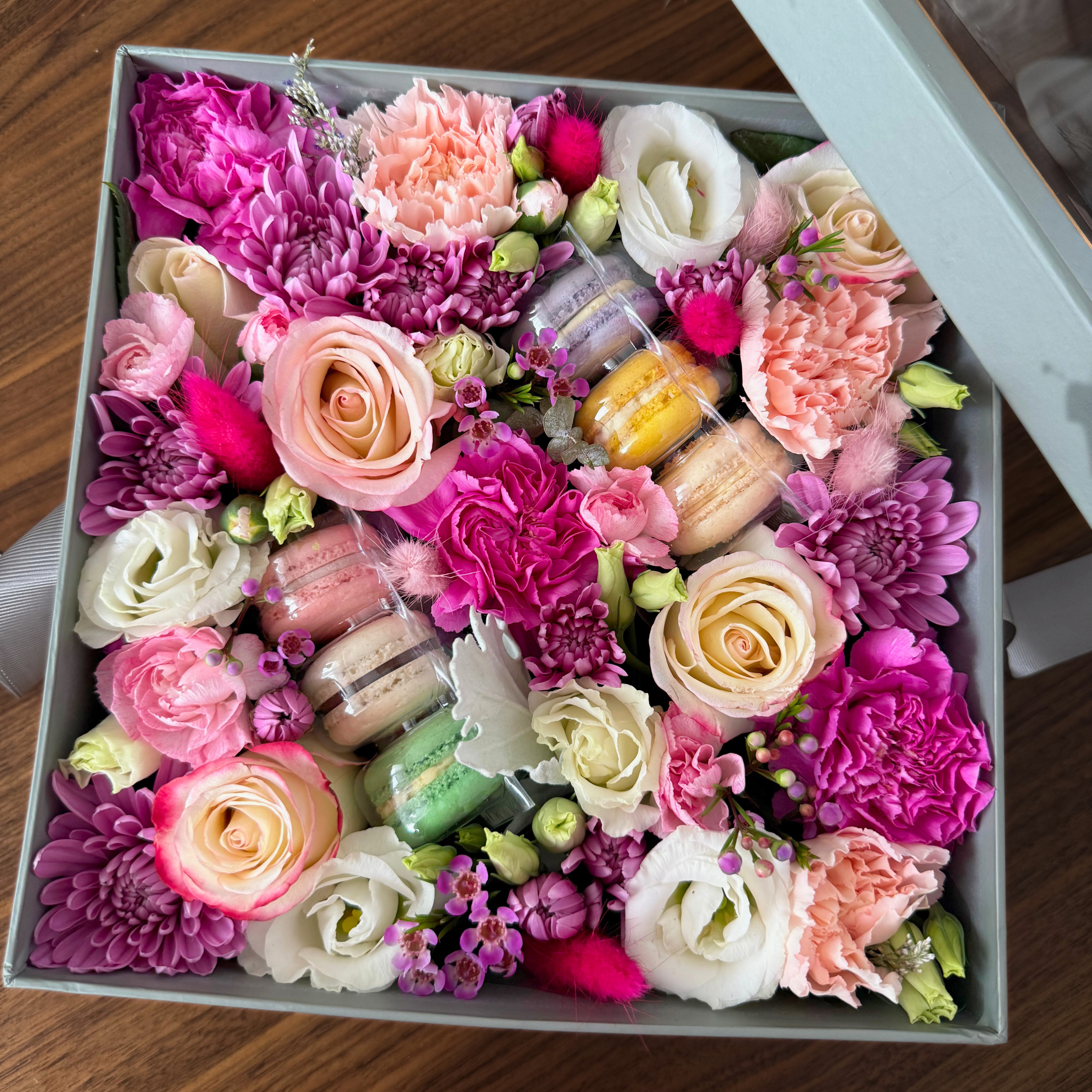 Pinkish flower arrangement with delicious Hand-made Macarons.