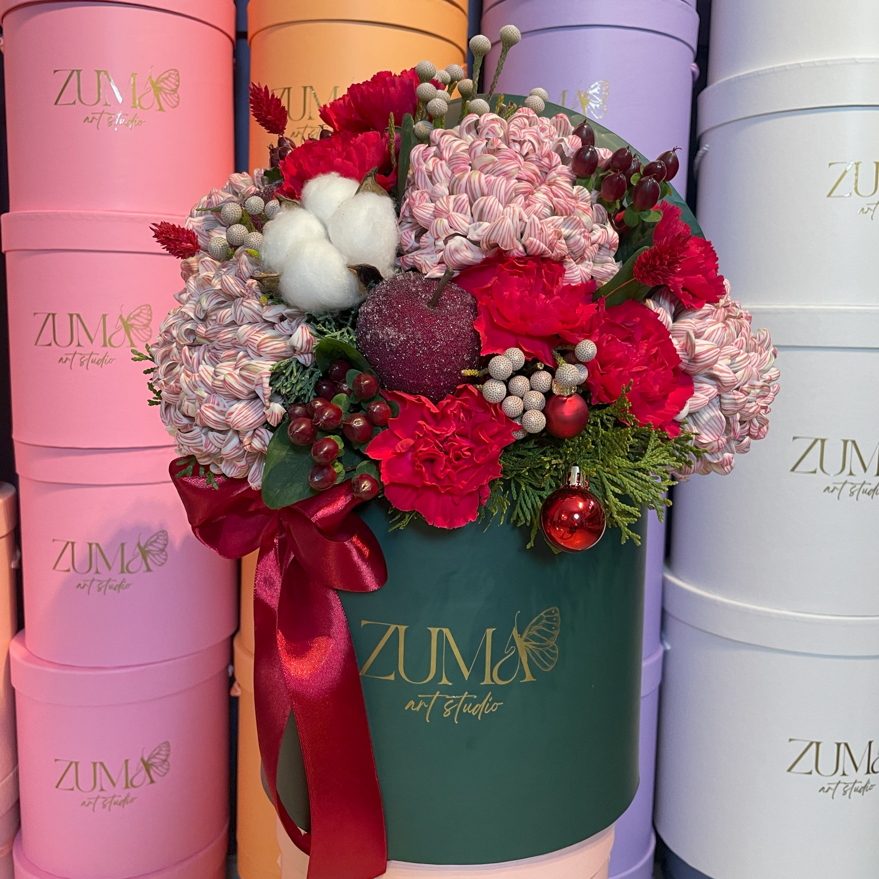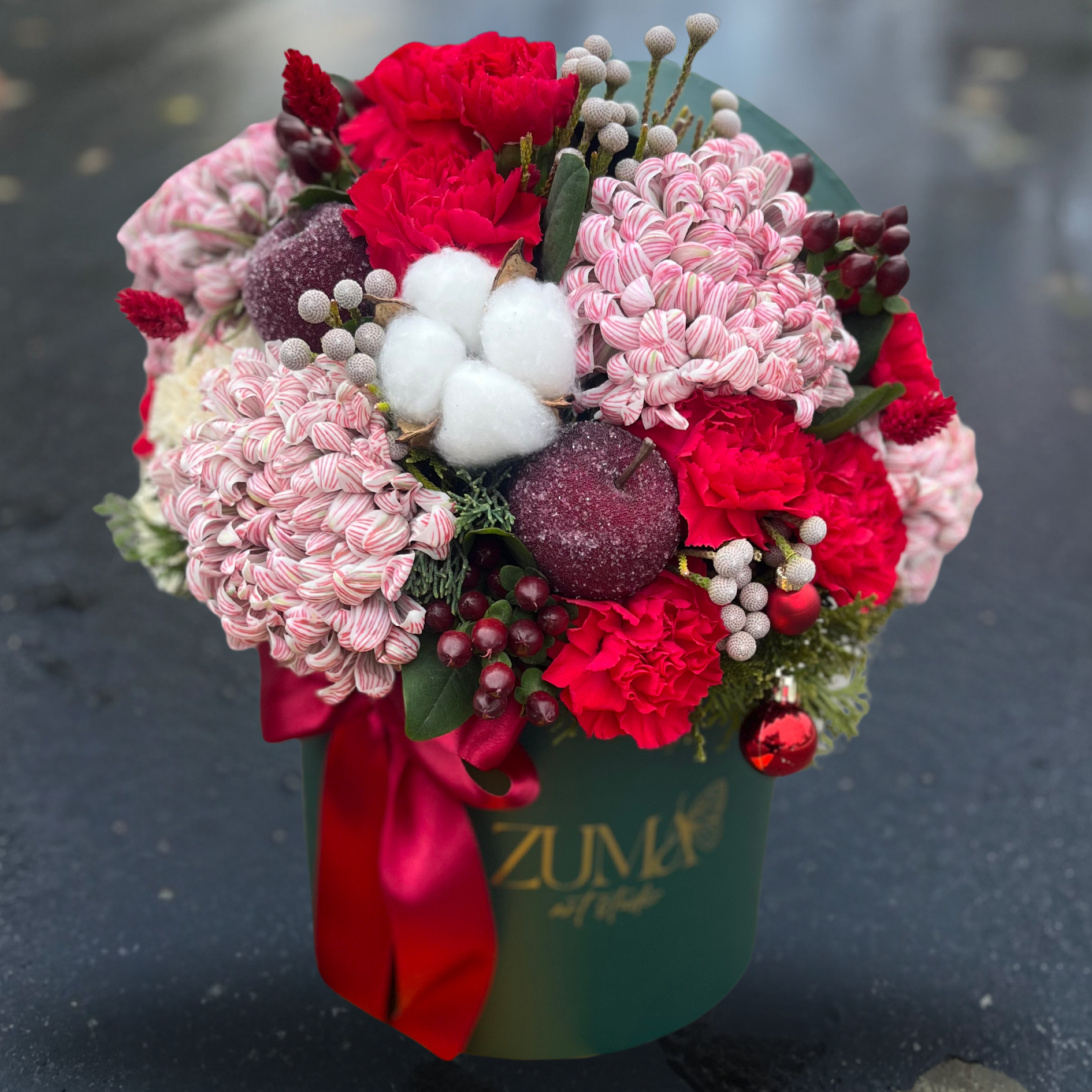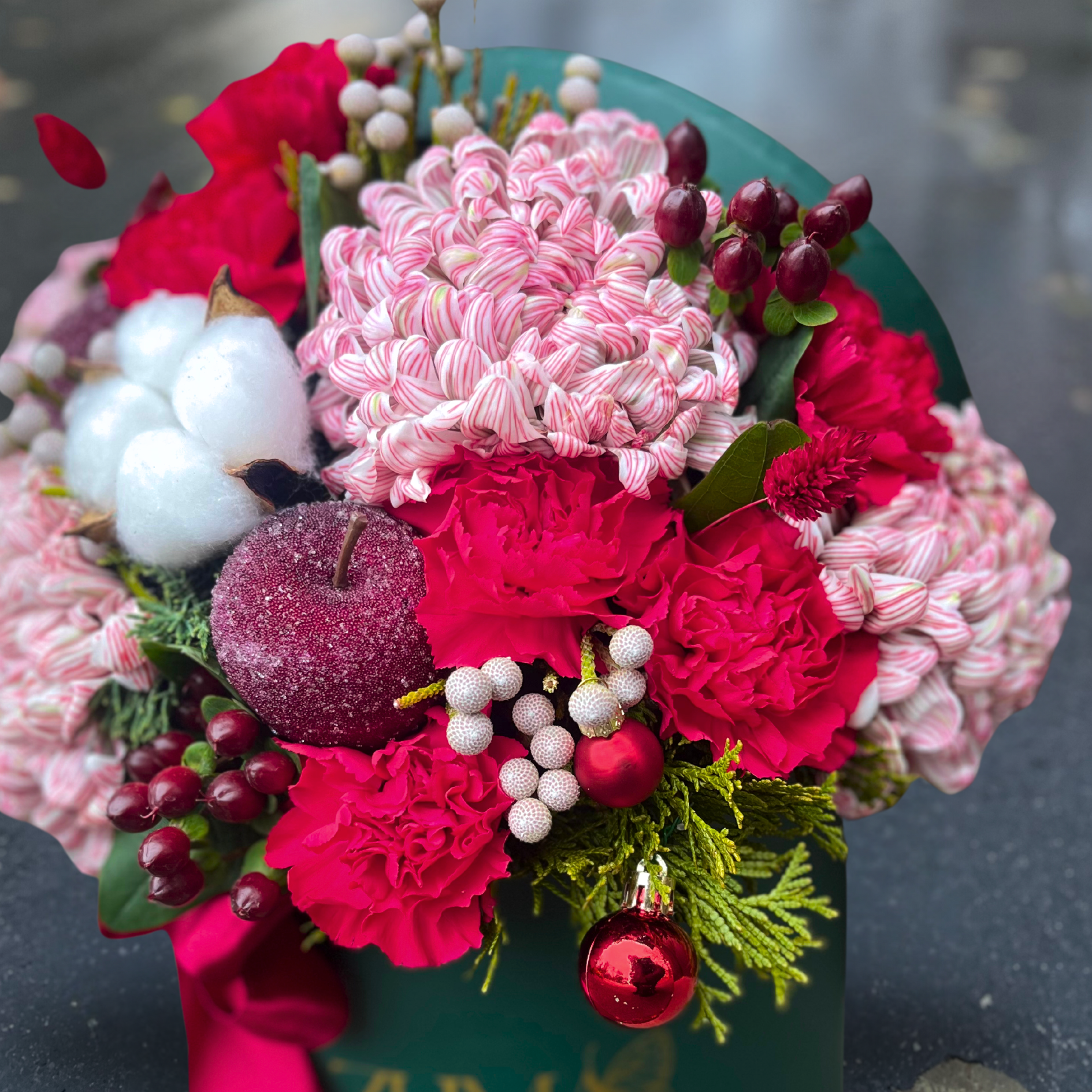 Celebrate the magic of the holiday season with our Magnificent Holiday Floral Arrangement. This festive design combines the timeless beauty of red and pink seasonal blooms with playful candy cane accents, frosted ornaments, and cotton details for a luxurious holiday touch. Arranged in a stylish emerald green box adorned with a bold red ribbon, this bouquet is the perfect centerpiece or gift for spreading holiday cheer.