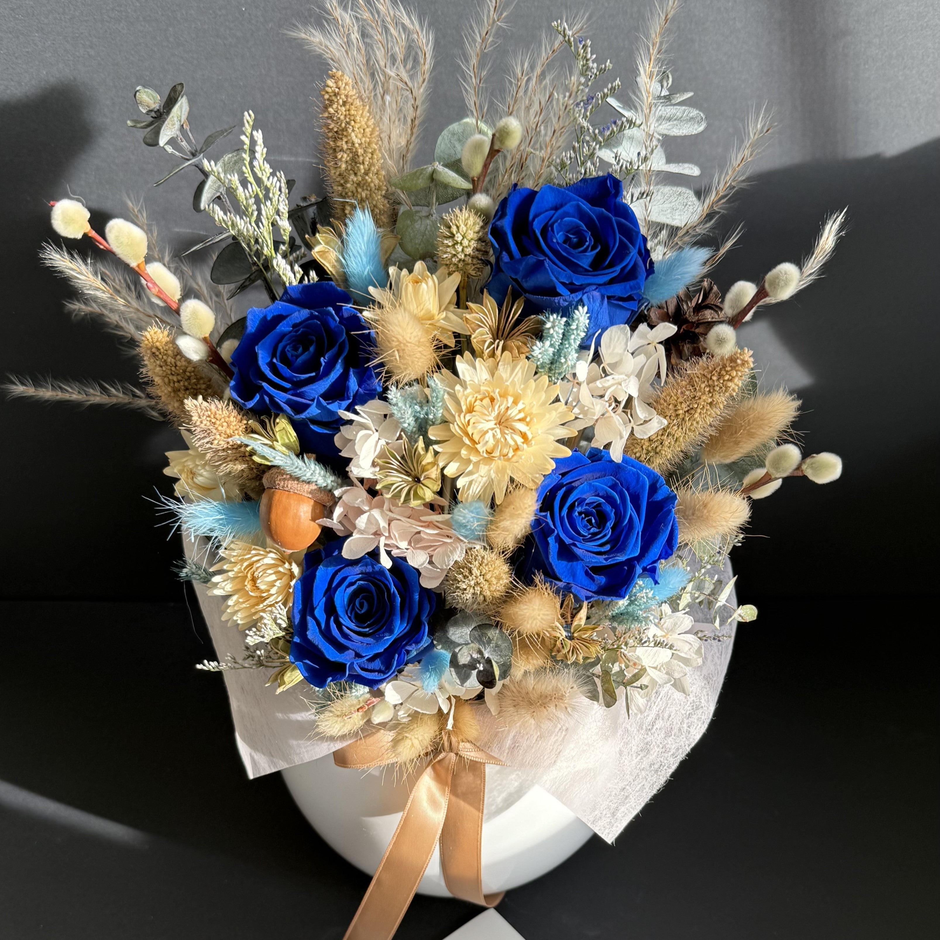 Infuse timeless beauty and charm into any space with the Everlasting Elegance Royal Blue Bouquet. This exquisite arrangement features preserved roses surrounded by an array of high-quality preserved and dried flowers, elegantly designed to last for at least 3 years or more. Each element is selected to bring elegance, warmth, and sophistication to your home or as a thoughtful gift.