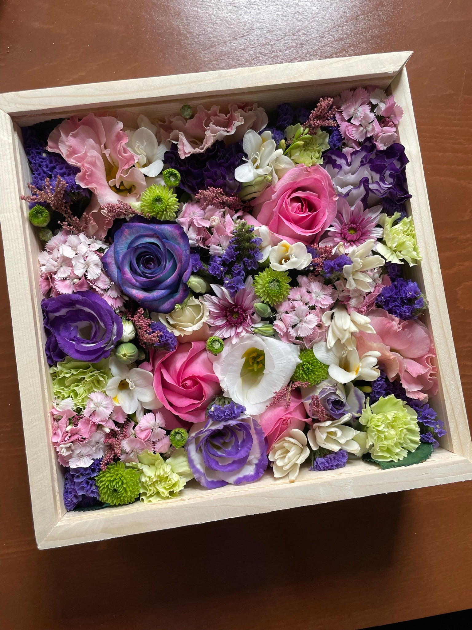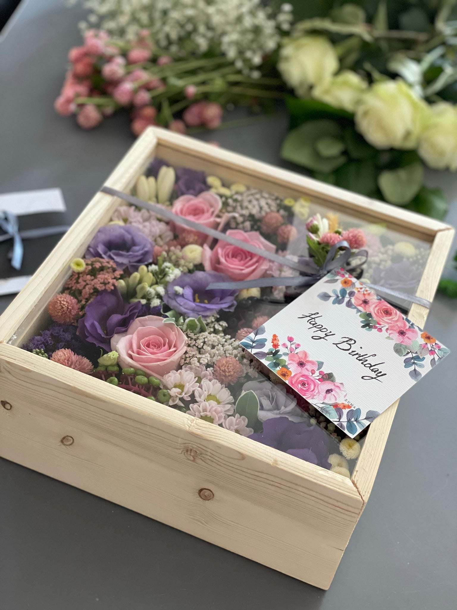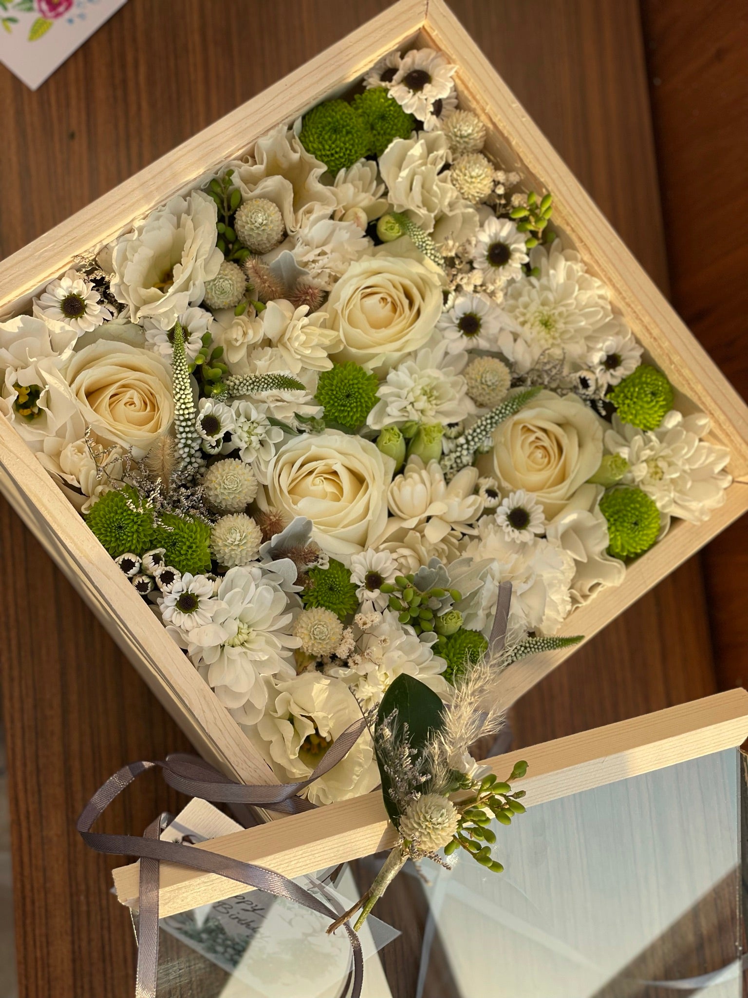 Charming Wooden Box: The flowers are arranged in a rustic yet elegant wooden box, with a transparent cover to keep the arrangement fresh while allowing the beauty of the blooms to shine through.