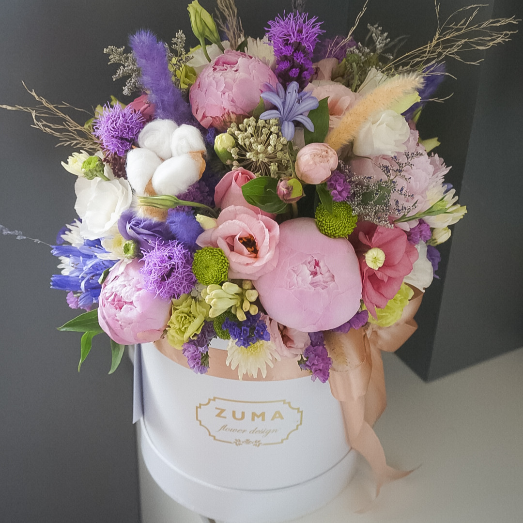 Elegant Presentation: The flowers are arranged in a luxurious white round box with the ZUMA logo and a soft satin ribbon, enhancing the sophisticated appeal of the arrangement.