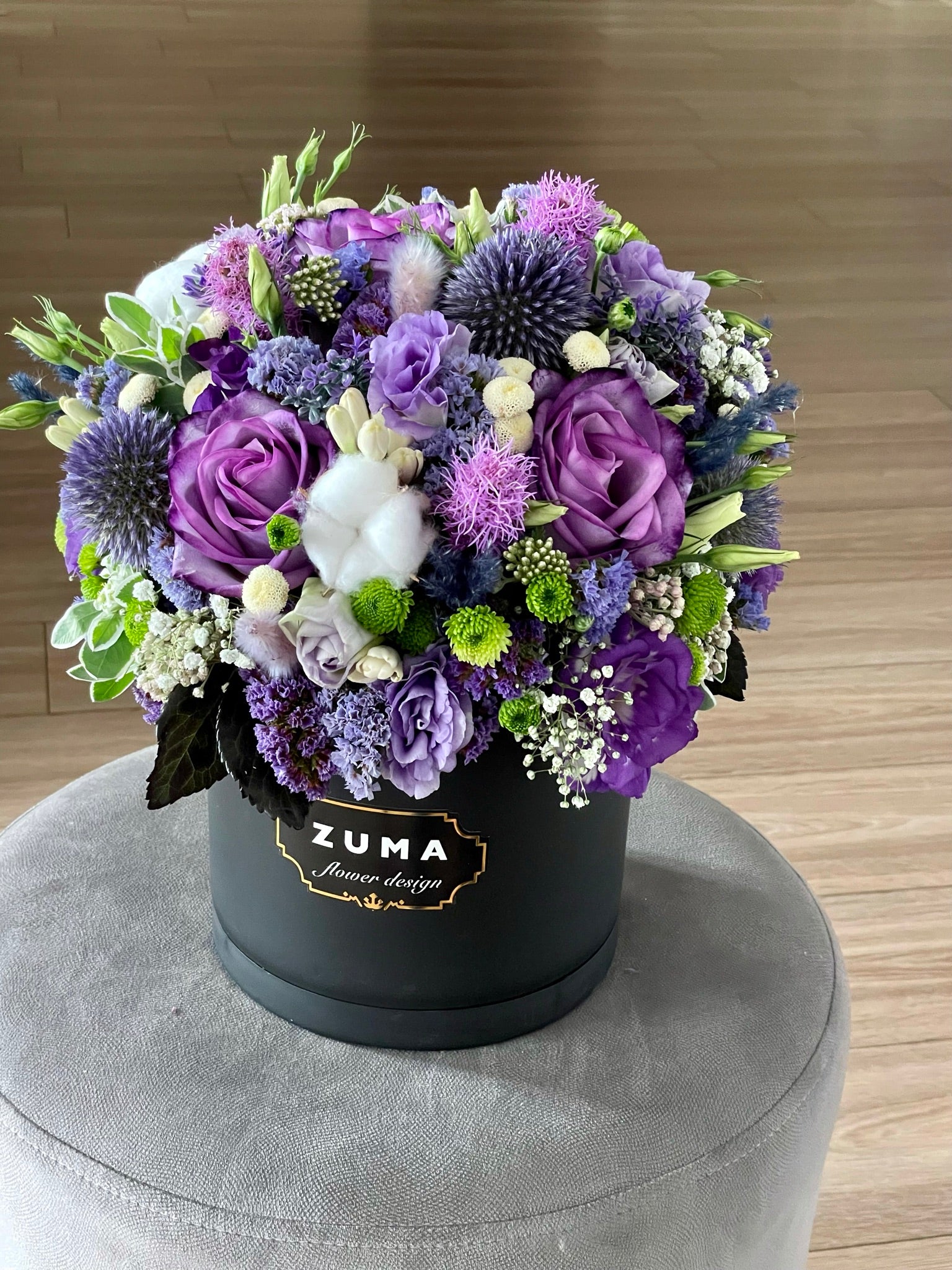 Experience the beauty of rich, vibrant purples with the Zuma Purple Dream Floral Box. This sophisticated arrangement brings together a luxurious mix of purple tones and textures, all beautifully presented in a sleek black box. Perfect for any occasion that calls for elegance and beauty, this floral display makes a bold and stunning statement.